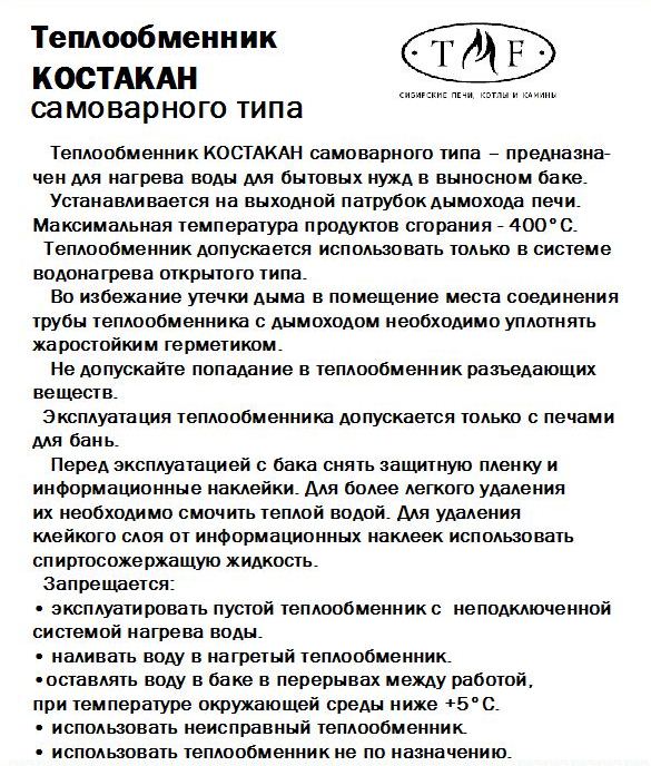 Предназначен для нагрева воды в выносном баке, устанавливаемый на выходной патрубок дымохода печи. Вода в теплообменнике нагревается за счет отходящих в дымовую трубу горячих газов. Такой теплообменник можно повернуть штуцером в любую сторону.