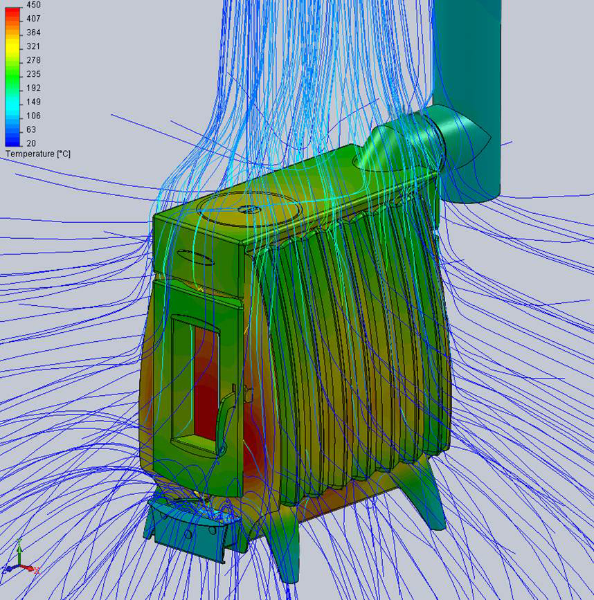 Чтобы идти в ногу со временем, мы решили построить и проанализировать математическую компьютерную модель тепловых и гидравлических процессов, происходящих в дровяной печи. Мы вычислили доли лучистой и конвекционной составляющей тепла, передающегося от горящих дров к поверхностям нагрева. Просчитали и оптимизировали геометрию топливника и конвекторов, аэродинамику тракта движения топочных газов внутри печи и конвективных потоков воздуха снаружи. Сформировали полную картину распределения температурных полей, подвергли тщательным расчетам тепловую равнопрочность элементов печи и численно оценили их тепловую эффективность.
