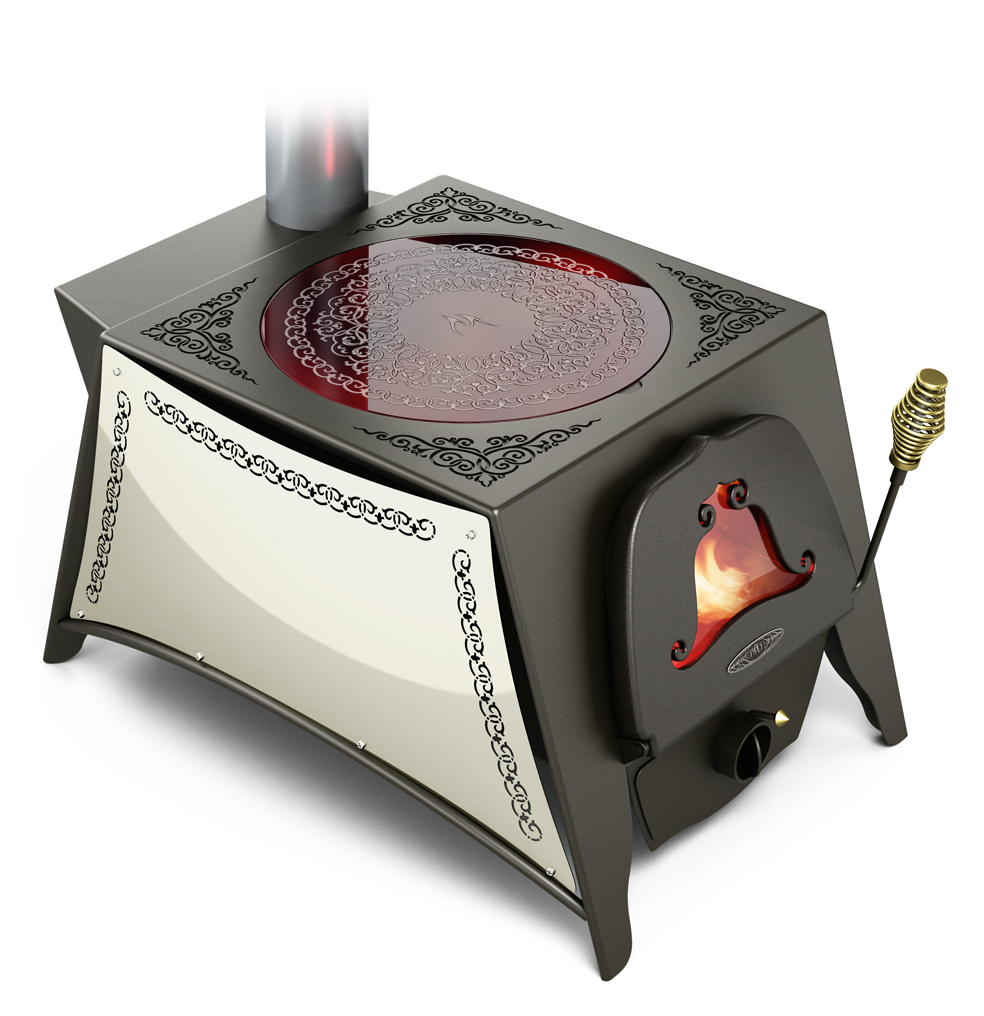 Корпус печи изготовлен из высоколегированной жаростойкой стали с содержанием хрома до 13%. Печь имеет возможность тонкой настройки интенсивности горения и поддерживает режим длительного горения. Чугунная дверца печи оснащена светопрозрачным экраном и самоохлаждающейся ручкой для удобного управления процессом горения. Съемная стеклокерамическая или чугунная варочная поверхность позволяет готовить пищу на открытом огне, в том числе и в казане.