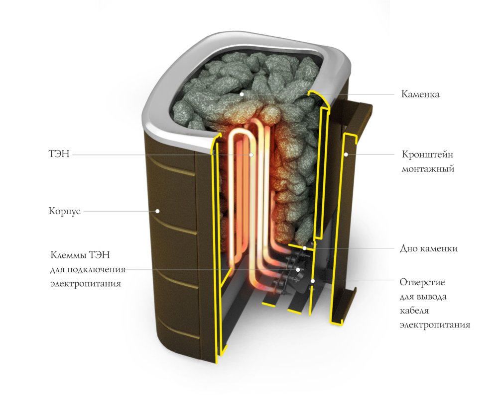 Трубчатые электронагреватели (ТЭНы) печи сделаны из жаростойкой нержавеющей стали, стойкой к различному температурному и коррозионному воздействию. При необходимости вы можете дополнительно приобрести ТЭН на 6 или 9 кВт в разделе «Комплектующие для печей».