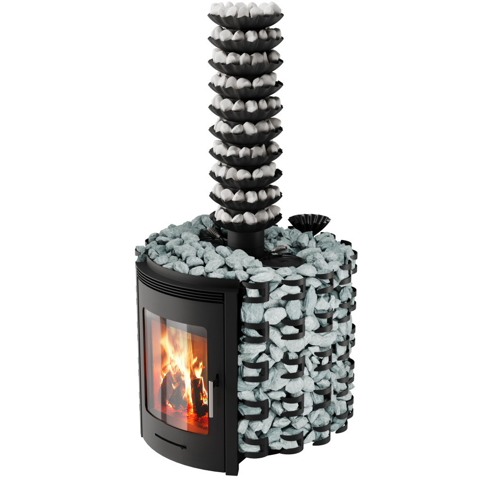 • Декоративная отделка печи заимствована у банной печи «Семирамида». Камни визуально висят в воздухе, поскольку закреплены на печи без сеток и решёток элегантными лепестками