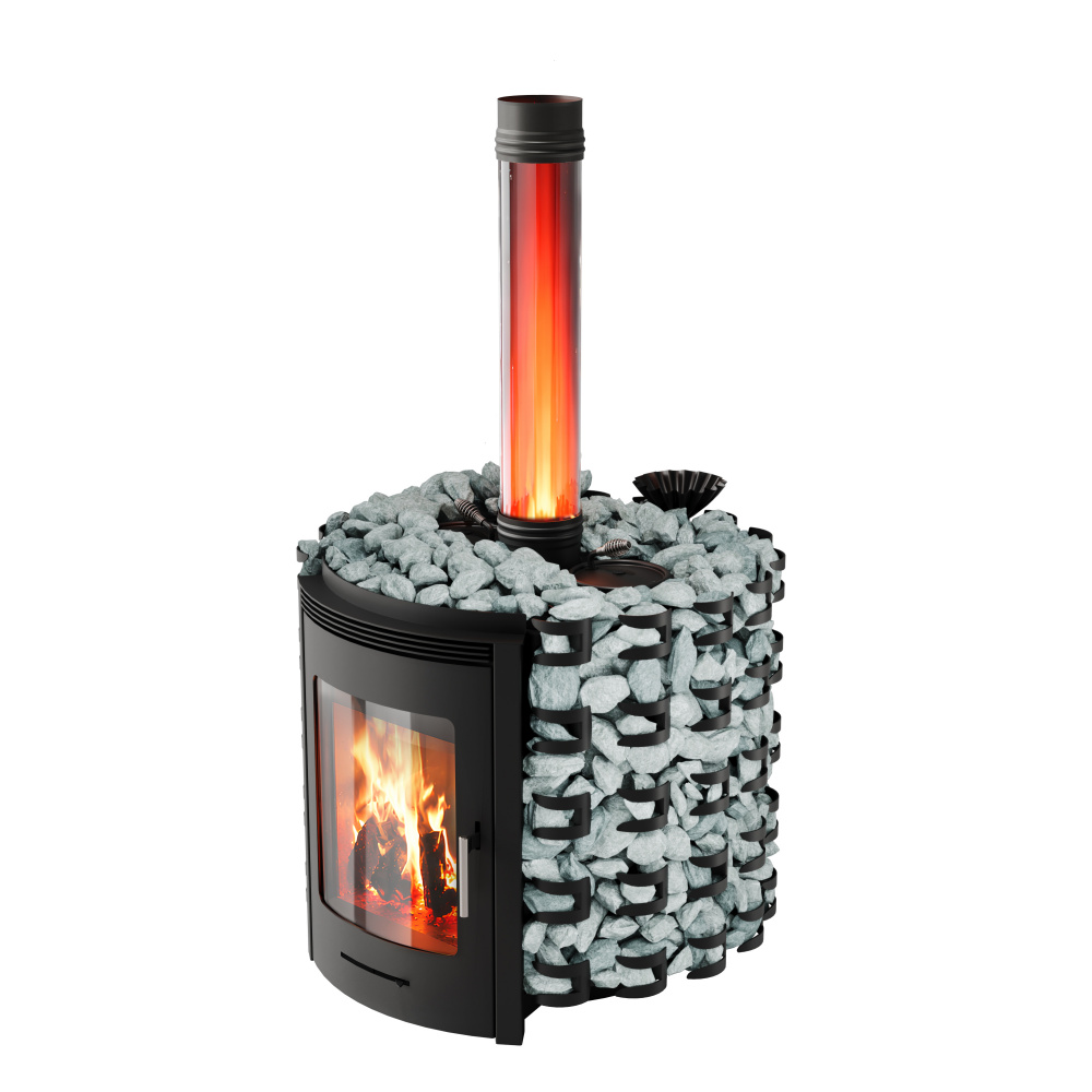 Печь «Химера» изготавливается только под заказ. Может поставляться в комплекте с светопрозрачным модулем стартового дымохода или с натрубной каменкой «Регалия».
