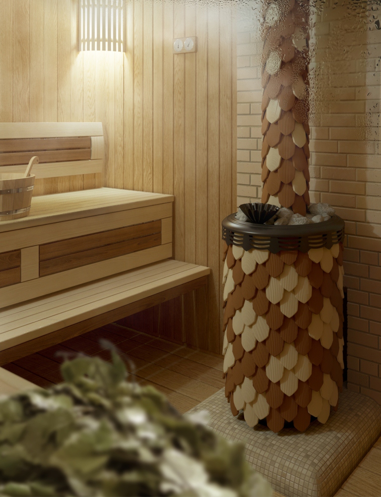 Мы соединили древнейший рукотворный материал с нерукотворным чудом природы, сделав чешую панголина из терракоты, и покрыв ею металлическую печь.Не зря многие обладатели металлических банных печей обкладывают их кирпичом. Потому что нагретая поверхность кирпича, сделанного из той же обожженной глины, излучает приятное, мягкое тепло, столь ценимое любителями русской бани.