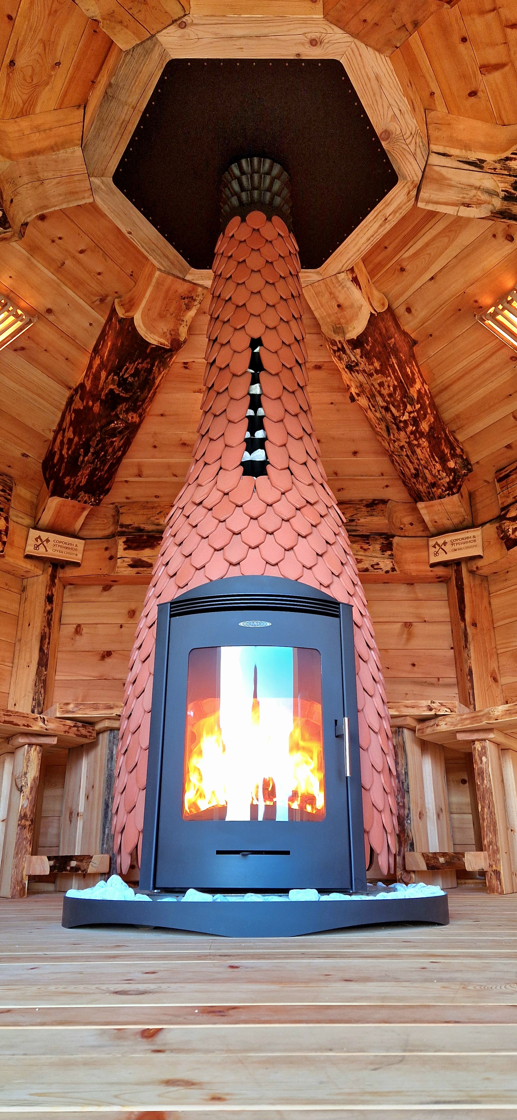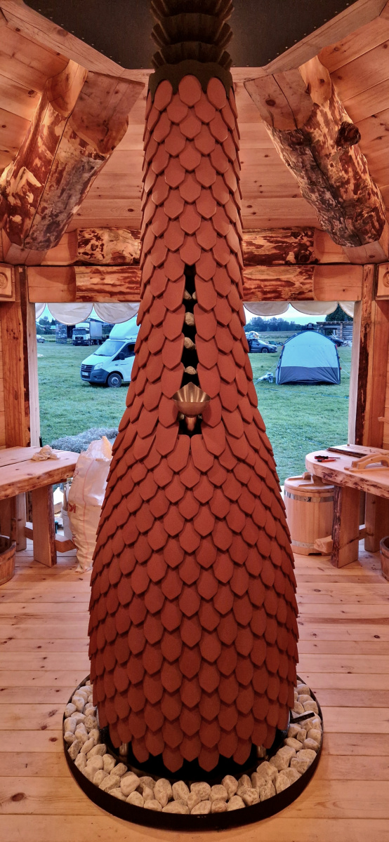 Декор построен на сочетании нерукотворного и рукотворного элементов: чешуя, встречающаяся в природе, и терракотовая керамика — обожжённая глина. Терракота — древнейший синтетический материал человечества и самый древний материал для изготовления печей, ещё со времён, когда люди обмазывали глиной свои очаги.Мягкое тепловое излучение.